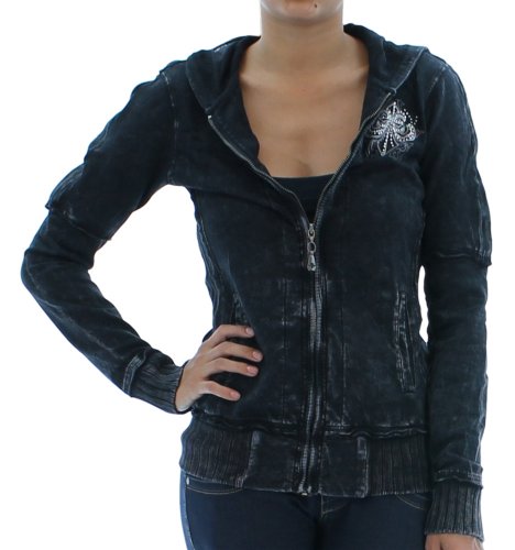 Affliction Clothing's ability to set the bar high in fashion is evident in its collection's indulgence of style and design, focus on quality, and its trademark series of divinely executed, dark and powerful themes. Affliction is a mainstay for the most elite athletes, heaviest bands, A-listers and the fashion conscious worldwide. This Sacrament Custom Jacket features zip up front closure with hood, stitch detail all over with graphic and rhinestone detail on front and back, front slant pockets, ribbed elastic waistline, and all over distress color. Made of 100% cotton and machine washable.