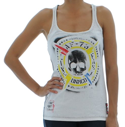 Affliction Clothing's ability to set the bar high in fashion is evident in its collection's indulgence of style and design, focus on quality, and its trademark series of divinely executed, dark and powerful themes. Affliction is a mainstay for the most elite athletes, heaviest bands, A-listers and the fashion conscious worldwide. This Tough World racer back tank top features the burnout style material with graphic Affliction logo on front and back, and patch on bottom right side. It is made in the USA of 50% cotton, 50% polyester and is machine washable.