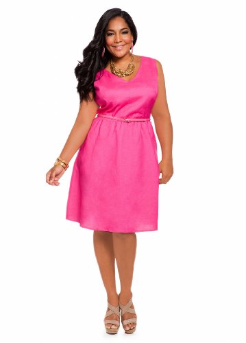 We added a modern element to our essential linen dress with a contrasting belt for that can't-resist pop of color. Plus size dress features a double v-neckline that leads to a hidden hook-and-eye- zip back closure and is finished with a colorful conventional belt at waist and an allover solid print. We adore this dress with delicate peep-toe pumps and matching clutch for a super chic style.