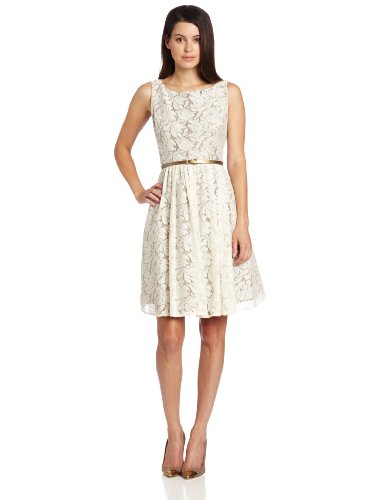 Jessica Howard Women's Petite Sleeveless Belted Party Dress, Ivory/Beige, 10
