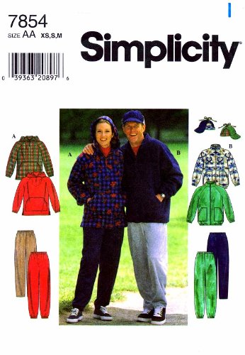 1990's Simplicity 7854 Sewing Pattern Misses', Men's and Teens' Jacket, Top, Pants and Hat: Loose-fitting jacket and top has long elasticized raglan sleeves and front patch pockets. Pullover top A has hood and front slit with button and loop closure and optional side slits. Jacket B has front zipper, band collar and elasticized lower edge. Pull on pants with elastic waistline casing can be made with or without elastic ankle casings. Hat in sizes S(21 1/2"), M(22 1/2") and L(23 1/2"). Suitable for Overlock / Serger.